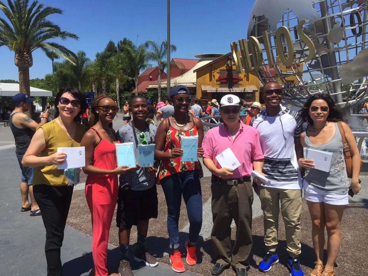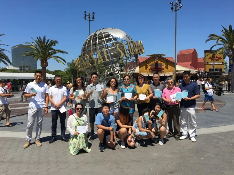 8月14日中午,执行会长周刚、理事长黄里人带领美国杭州商会20余位会员,前往洛杉矶地标好莱坞环球影城宣传G20杭州峰会。大家冒着酷暑,不停地向游客们介绍G20、宣传杭州,并将印有G20杭州峰会标志的手机壳、书签,杭州的小画册送给他们。