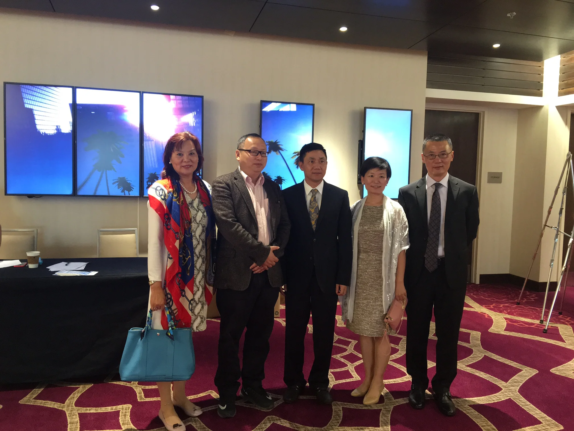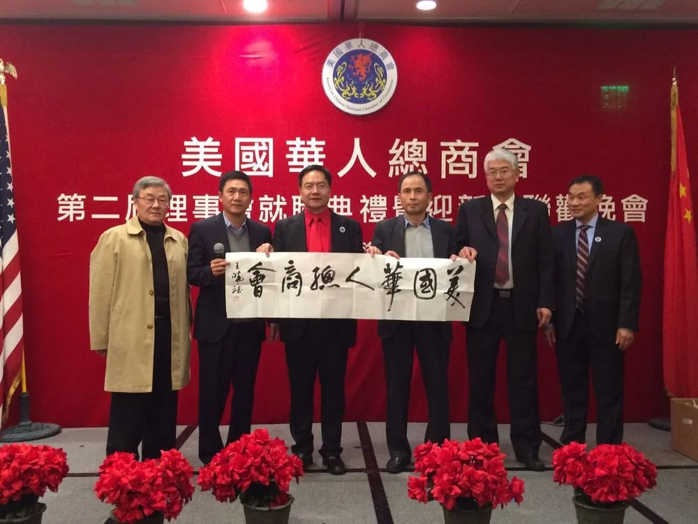 2016年1月16日晚,美国华人总商会在洛杉矶举办第二届理事会就职典礼。我会周刚、黄里人、叶建、钟学正、朱建民、潘琪、张群华和吴亚英受邀参加了会议,并代表我会向美国华人总商会赠送了著名书法家王晓赋先生的书法“美国华人总商会"。宗泽后、周刚、黄里人和叶建被美国华人总商会聘为荣誉顾问。