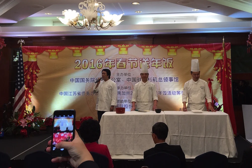 2016年2月20日,由中国国务院侨办和中国驻洛杉矶总领事馆主办的2016年春节送年饭活动在洛杉矶美丽华大酒店隆重举行。中国国务院侨办裘援平主任、中国驻洛杉矶刘健总领事,以及华人华侨代表们一起欢度中国农历新年。从江苏省请来的几位名厨特别为大家做了几道名菜,有文思豆腐、狮子头等。
